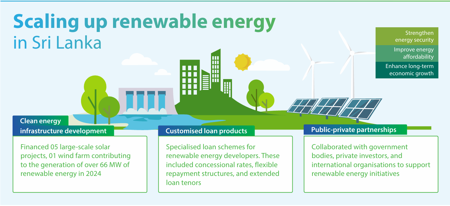 In 2024, we expanded our focus on sustainability, leveraging our leadership position to further align with global frameworks such as SDGs. At the national level, we supported Sri Lanka’s Nationally Determined Contributions (NDCs) by promoting green financing and sustainable investments in renewable energy, climate-resilient agriculture, and low-carbon infrastructure. Through our alignment with the Sustainable Finance Roadmap of the CBSL, we have also championed industry-wide best practices, setting new benchmarks for ESG-driven solutions.